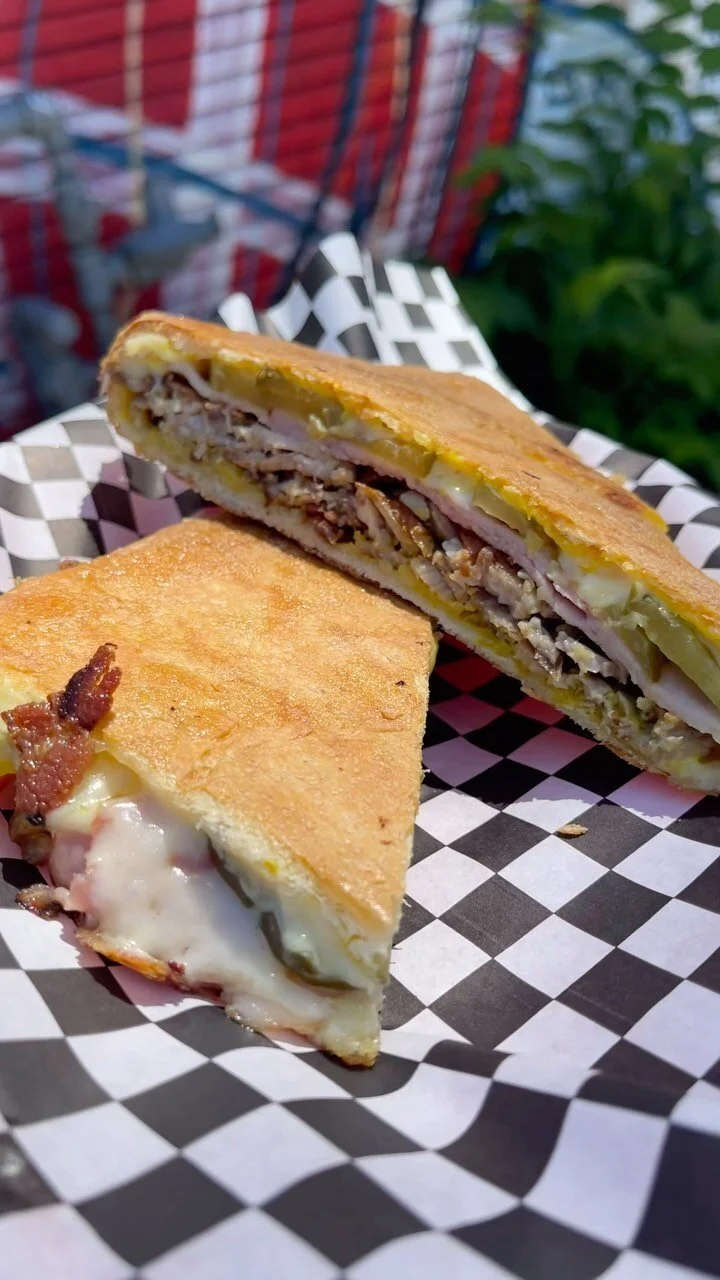 Achiote rubbed porchetta, caramelized pineapple pico, cotija cheese, San Antonio Bakery bollio bread