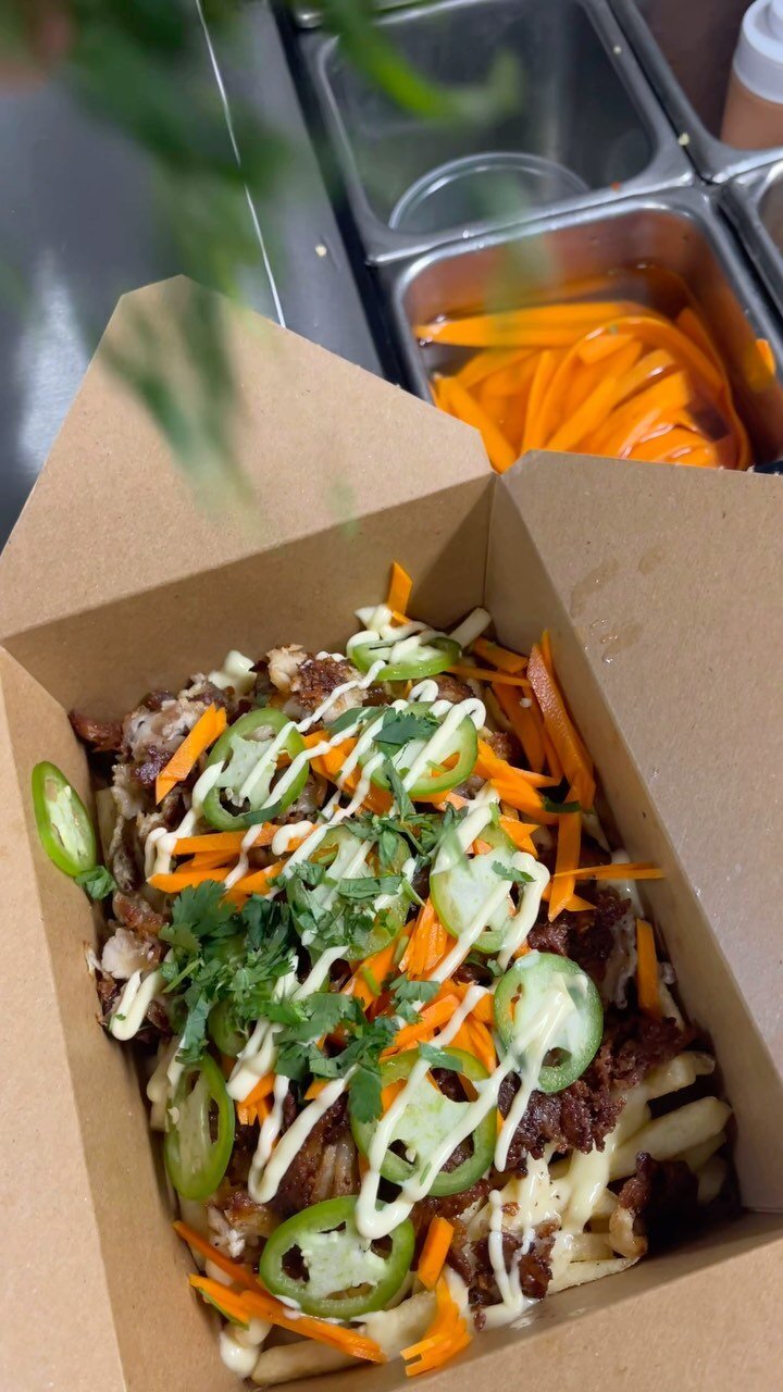 Red miso porchetta, pickled carrots, jalepeño, cilantro, black sesame kewpie mayo